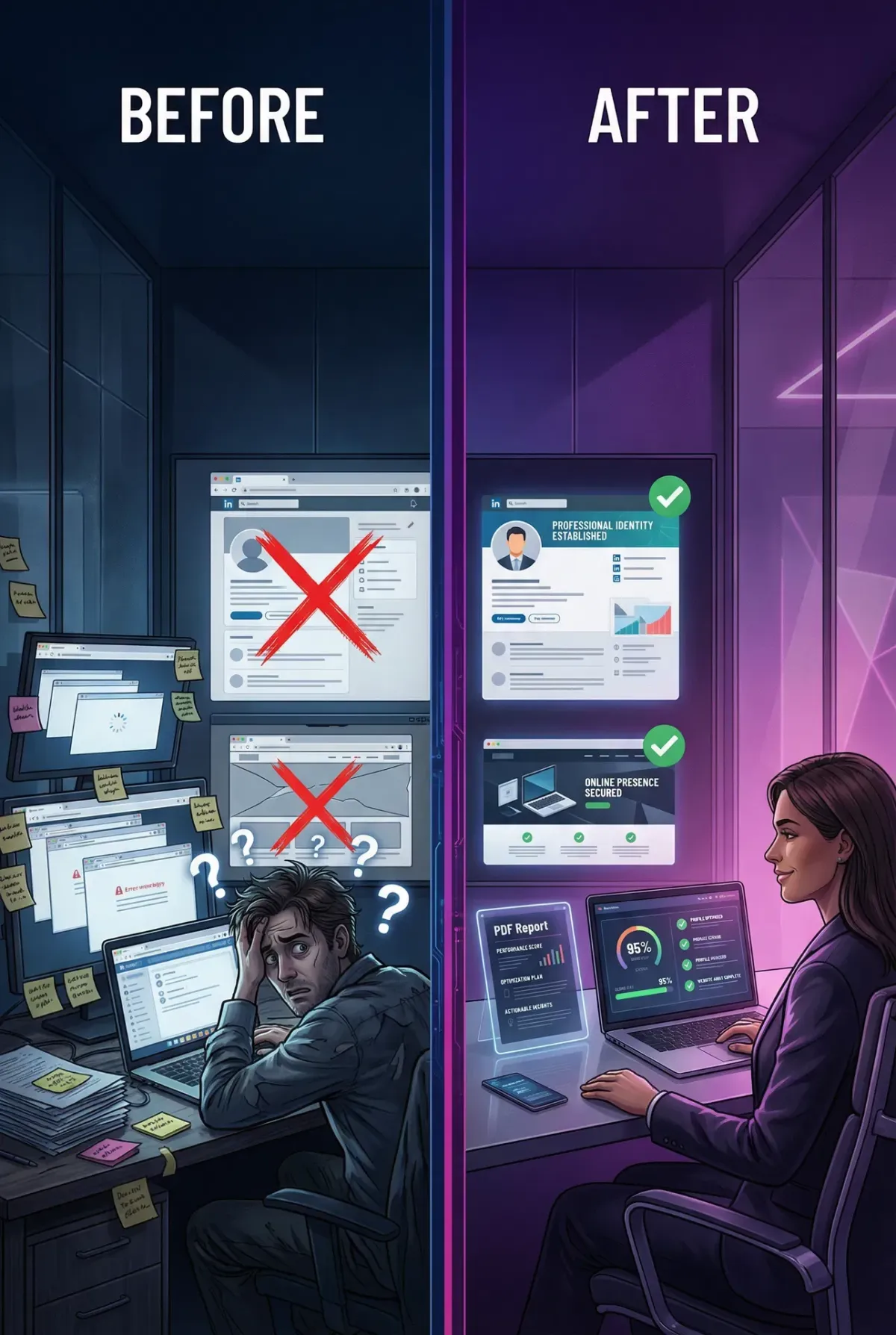 This isn't a self-assessment where you score your own marketing. The Digital Mentors Clarity Engine reviews your actual LinkedIn, your actual website, and your actual content. It finds the things you can't see from the inside.