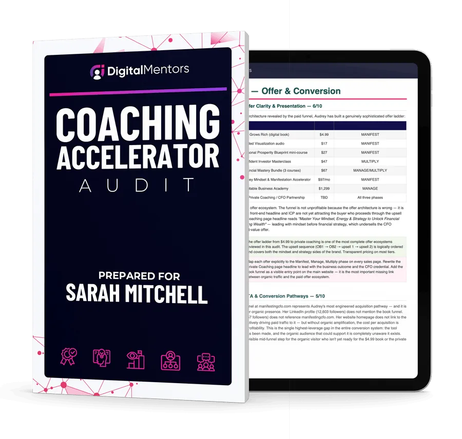It's free. We built a proprietary AI diagnostic system (the Digital Mentors Clarity Engine) that lets us deliver this depth of analysis without the manual hours it would normally require. We're offering it free during our 2026 launch because we want results and testimonials from real coaches. After you receive the audit, there's an optional next step (a paid Client Acquisition Playbook), but it's entirely separate and completely optional. The audit stands on its own.